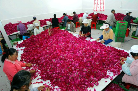 “月餅、飲料、糖果等食品領(lǐng)域?qū)κ秤妹倒逶系男枨罅棵磕暝?—5萬噸之間,云南的食用玫瑰種植面積雖然已超過5000畝,但仍有90%的市場空間等待開發(fā)!痹颇鲜』ɑ墚a(chǎn)業(yè)辦公室工作人員陸繼亮說。