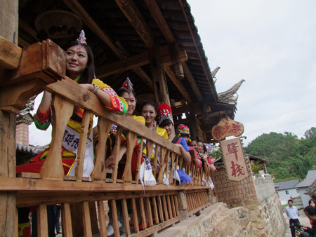 門(mén)樓后面,一條蜿蜒的石板路直直伸向古鎮(zhèn)深處,穿過(guò)古鎮(zhèn)又逶迤而去,消失在茫茫群山和云海之間。古道兩旁的房子如今都住了當(dāng)?shù)鼐用,有?hù)人家緊閉的大門(mén)外豎著南方田野耕作常見(jiàn)的木板車(chē),道上有農(nóng)婦頭戴帽子肩挑瓜果一路前行,絲毫沒(méi)有被我們長(zhǎng)長(zhǎng)的鏡頭所打擾。有的人家新刷了墻漆,在一排老房子中格外顯眼。