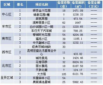 本周各區(qū)域房地產(chǎn)市場交易套數(shù)三強:本周備案前三強分別位于呈貢、東市區(qū)與南市區(qū),排名先后順序為:大方居、溪畔麗景小區(qū)、春城時光花園和東盟森林小區(qū),其中春城時光花園與東盟森林小區(qū)并列第三。注:由于備案系統(tǒng)未公布成交金額,故備案金額暫時空白。