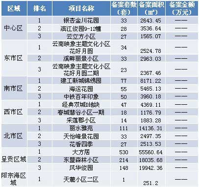 本周各區(qū)域房地產(chǎn)市場交易套數(shù)三強(qiáng):本周備案前三強(qiáng)均位于呈貢區(qū)域,排名先后順序為:大方居、東盟森林小區(qū)和風(fēng)華俊園。注:由于備案系統(tǒng)未公布成交金額,故備案金額暫時空白。