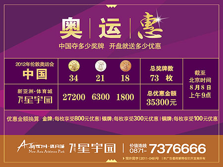 2012年8月8日,奧運會的第12天,也是長豐地產(chǎn)開發(fā)的新亞洲體育城星宇園送優(yōu)惠的第11天,截至上午9點半,中國隊已經(jīng)獲得了73枚獎牌,其中金牌34枚,銀牌21枚,銅牌18枚。按照1枚金牌優(yōu)惠800元,1枚銀牌優(yōu)惠300元,1枚銅牌優(yōu)惠100元的規(guī)則,星宇園的開盤優(yōu)惠已經(jīng)累計到了35300元!