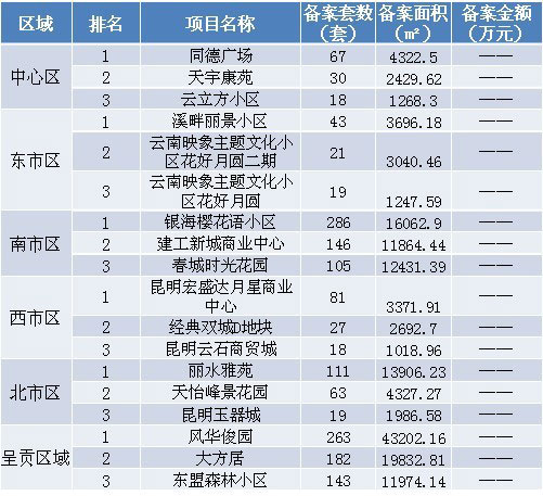 本周各區(qū)域房地產(chǎn)市場(chǎng)交易套數(shù)三強(qiáng):本周備案前三強(qiáng)分別位于南市區(qū)與呈貢區(qū)域,排名先后順序?yàn)椋恒y海櫻花語(yǔ)小區(qū)、風(fēng)華俊園和大方居。注:由于備案系統(tǒng)未公布成交金額,故備案金額暫時(shí)空白。