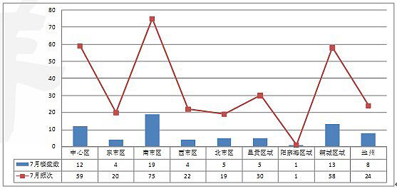從投放項目來看,7月份投放頻次主要集中在南市區(qū)、中心區(qū)和輔城區(qū),分別有75次、59次及58次;昆明主城區(qū)北市區(qū)的投放頻次最少,共投放19次,輔城區(qū)陽宗海區(qū)域的投放次數(shù)最少,共投放1次。總體看來7月份項目投放頻次比6月項目投放頻次有所增加。