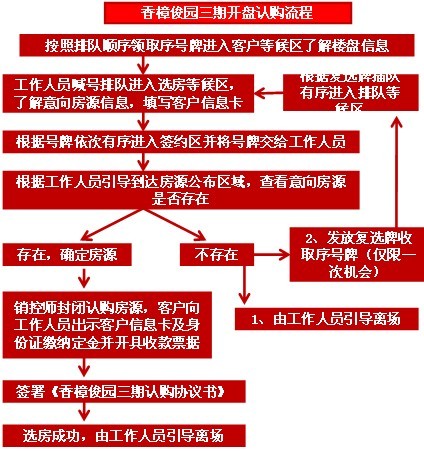 客戶通過簽到序號牌的發(fā)放順序,由現(xiàn)場主持人叫號分批次(5個號一批)進入選房區(qū)選房,選房成功后簽訂認購協(xié)議,手續(xù)辦理完成后退場;