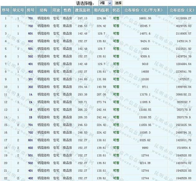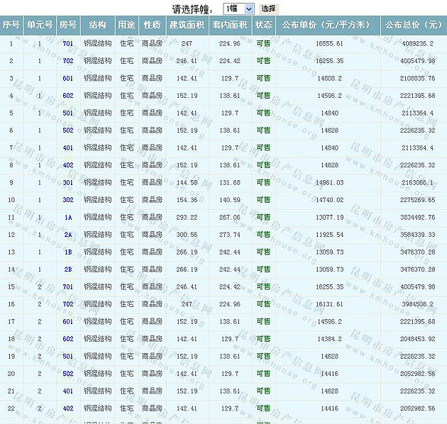 根據(jù)云南省物價(jià)局關(guān)于發(fā)布《云南省商品房銷售明碼標(biāo)價(jià)實(shí)施細(xì)則(試行)》的通知,現(xiàn)將該項(xiàng)目商品住房的準(zhǔn)售房源及每套房屋價(jià)格向社會(huì)公布,房地產(chǎn)開發(fā)企業(yè)應(yīng)嚴(yán)格按照公布價(jià)格,商品房銷售明碼標(biāo)價(jià)實(shí)行一套一標(biāo)。商品房經(jīng)營(yíng)者應(yīng)當(dāng)對(duì)每套商品房按照建筑面具進(jìn)行明碼標(biāo)價(jià),否則,房產(chǎn)登記機(jī)關(guān)不予登記備案。準(zhǔn)售房源及房?jī)r(jià)信息如下: