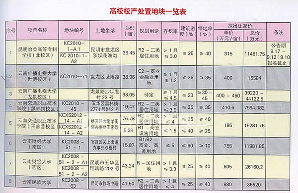 接下來(lái),昆明土地和礦業(yè)權(quán)交易中心還將陸續(xù)拍賣(mài)7塊共9宗其他高校土地,包括云南廣播電視大學(xué)、云南財(cái)經(jīng)大學(xué)、云南交通職業(yè)技術(shù)學(xué)院、云南民族大學(xué)高校擬處置地塊將陸續(xù)出讓。