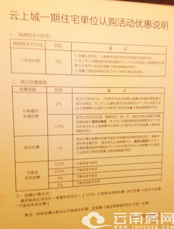 2、認(rèn)購意向申請優(yōu)惠分為2%、1.5%、1%,其中在2012年9月1日、9月2日兩天內(nèi)成功辦理認(rèn)購意向申請手續(xù)的客戶認(rèn)購后,在工作人員通知查檔回執(zhí)領(lǐng)取后3個工作日內(nèi),至萬科云上城銷售中心的客戶,開盤可享2%的優(yōu)惠;