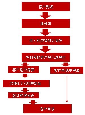 客戶通過(guò)認(rèn)籌卡顏色及發(fā)放順序,由現(xiàn)場(chǎng)主持人叫號(hào)分批進(jìn)入選房區(qū)選房,成功后簽訂認(rèn)購(gòu)協(xié)議,領(lǐng)取禮品退場(chǎng)。