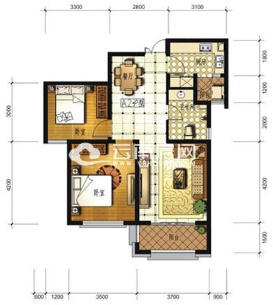 戶型推薦:A2戶型2室2廳1廚1衛(wèi)2陽臺84平米