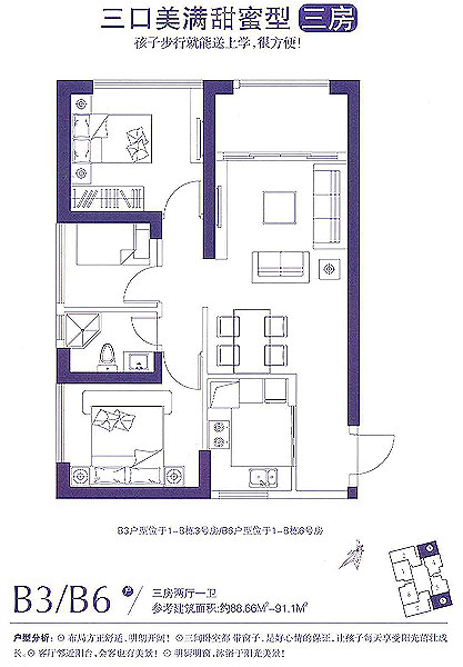 戶型推薦:B3/B6戶型3室2廳1衛(wèi)約88.66-91.1平米