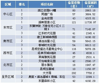 本周各區(qū)域房地產(chǎn)市場交易套數(shù)三強(qiáng):本周備案前三強(qiáng)分別位于呈貢、東市區(qū)與西市區(qū),排名先后順序為:大方居、溪畔麗景小區(qū)與昆明宏盛達(dá)月星商業(yè)中心。注:由于備案系統(tǒng)未公布成交金額,故備案金額暫時空白。