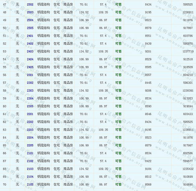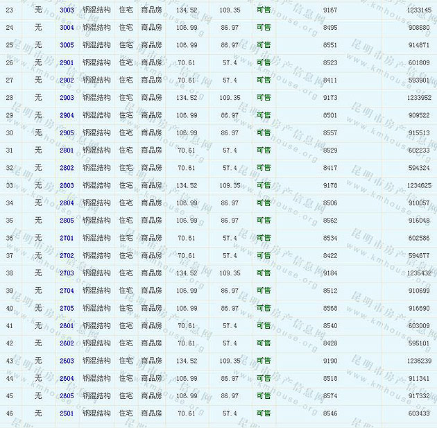 根據(jù)云南省物價局關(guān)于發(fā)布《云南省商品房銷售明碼標(biāo)價實施細(xì)則(試行)》的通知,現(xiàn)將該項目商品住房的準(zhǔn)售房源及每套房屋價格向社會公布,房地產(chǎn)開發(fā)企業(yè)應(yīng)嚴(yán)格按照公布價格,商品房銷售明碼標(biāo)價實行一套一標(biāo)。商品房經(jīng)營者應(yīng)當(dāng)對每套商品房按照建筑面具進(jìn)行明碼標(biāo)價,否則,房產(chǎn)登記機(jī)關(guān)不予登記備案。準(zhǔn)售房源及房價信息如下: