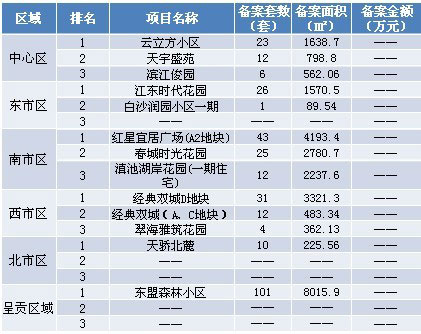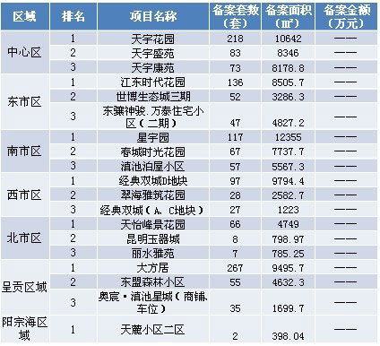 40周各區(qū)域房地產(chǎn)市場(chǎng)交易套數(shù)三強(qiáng):本周備案前三強(qiáng)分別位于呈貢、南市區(qū)與西市區(qū),排名先后順序?yàn)椋簴|盟森林小區(qū)、紅星宜居廣場(chǎng)(A2地塊)和經(jīng)典雙城D地塊。注:由于備案系統(tǒng)未公布成交金額,故備案金額暫時(shí)空白。
