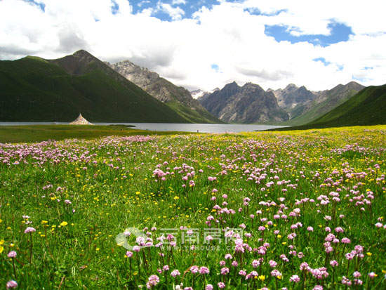 在賣(mài)票處買(mǎi)過(guò)票后,我們又上了好心司機(jī)的車(chē)。很快我們就到了公路的盡頭。下車(chē)來(lái),與他道別,然后各自背著大包還心存疑慮地往前走。這就到了嗎?這就是年寶玉則嗎?心里還這么亂亂地想著,上了柵欄缺口處的幾層石階,我們驚呆了,撲面而來(lái)的是一片花海。