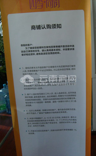 正當小編好奇為什么此次錦悅四季選鋪現(xiàn)場秩序那么好時,小編瞥見了此次商鋪認購須知,須知上明確錦悅四季此次開盤按客戶辦理意向卡先后順序進行喊號入場,還特意提醒客戶不必過早排隊,可以在休息區(qū)等候,待叫到自己意向卡號時入場即可。這也難怪為何購房者寧可坐著糾結(jié)自己選哪個商鋪好也不愿意跑去選房區(qū)附近湊熱鬧了,因為去了也是白去,與其去跟著選鋪成功的人激動,不如在選房區(qū)冷靜的考慮清楚要買哪個商鋪,而不是等進入選鋪區(qū)再去猶豫不決,而與中意鋪面失之交臂。
