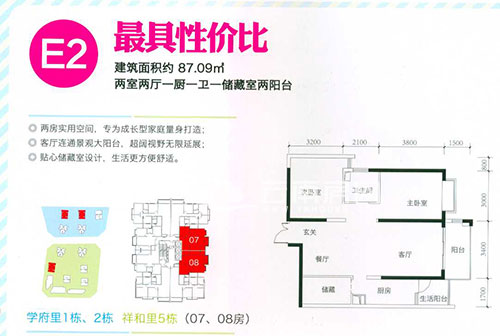 87.09平米的E2戶型為兩室兩廳一廚一衛(wèi)一儲藏室兩陽臺設(shè)計,分布在學(xué)府里(C地塊)1、2棟和祥和里(D地塊)5棟的07、08號房。從戶型圖上看,此戶型的設(shè)計較為方正,動靜區(qū)分明顯,空間布局合理,基本無空間浪費,是一個較為實用的戶型。