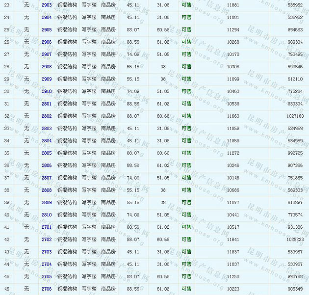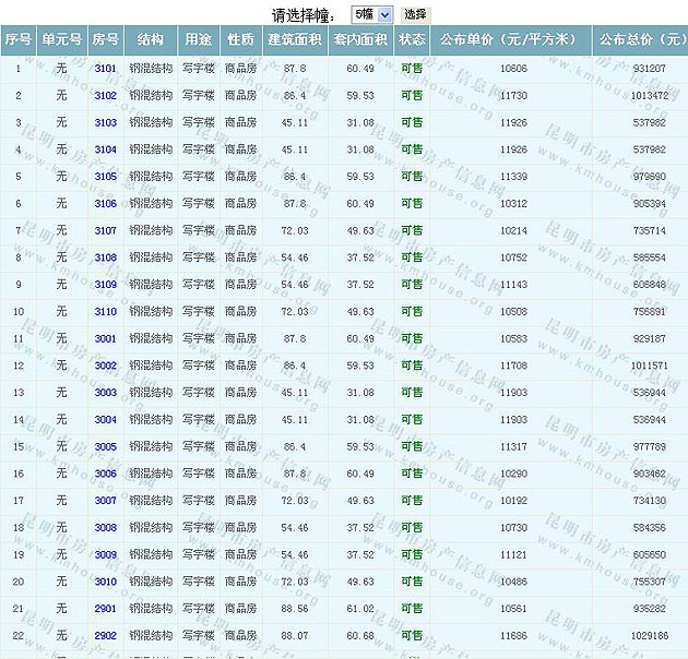 根據(jù)云南省物價局關(guān)于發(fā)布《云南省商品房銷售明碼標(biāo)價實施細(xì)則(試行)》的通知,現(xiàn)將該項目商品住房的準(zhǔn)售房源及每套房屋價格向社會公布,房地產(chǎn)開發(fā)企業(yè)應(yīng)嚴(yán)格按照公布價格,商品房銷售明碼標(biāo)價實行一套一標(biāo)。商品房經(jīng)營者應(yīng)當(dāng)對每套商品房按照建筑面具進行明碼標(biāo)價,否則,房產(chǎn)登記機關(guān)不予登記備案。準(zhǔn)售房源及房價信息如下: