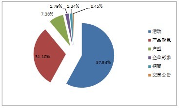 廣告訴求方面,9月份主要以項(xiàng)目的活動(dòng)類(lèi)廣告(包括開(kāi)盤(pán)、認(rèn)籌、促銷(xiāo)、開(kāi)業(yè)、優(yōu)惠等房地產(chǎn)項(xiàng)目活動(dòng))為主,分別占到整體廣告比例的57.94%,其次是產(chǎn)品形象類(lèi)廣告,占整體廣告比例的31.1%,戶(hù)型類(lèi)廣告占整體廣告比例的7.38%,而企業(yè)形象和招商類(lèi)廣告占比較小,分別占整體廣告比例的1.79%和1.34%,其中交房類(lèi)廣告占比最小,僅占整體比例的0.45%。