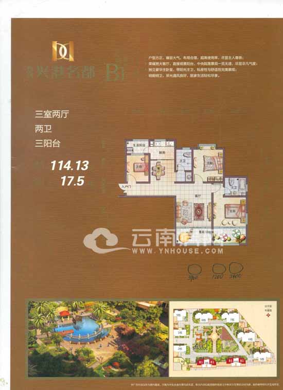 B1戶型為三房兩廳兩衛(wèi)三陽臺114.13平米,陽臺面積占17.5平米。該戶型主要分布在3棟、3A棟,戶型布局還算合理。寬大的客廳直接連著景觀陽臺,景觀陽臺面寬3.9米,面積大約在7平米左右,在景觀陽臺上便可覽盡中央院落景觀。主臥室?guī)И?dú)立衛(wèi)生間,私密性強(qiáng),而且是明衛(wèi),通風(fēng)好,不用擔(dān)心臥室會有異味,主臥與一個(gè)月6.5平米的景觀陽臺相接,采光、通風(fēng)都比較不錯。廚房連接生活陽臺,放置拖布和洗衣機(jī)也很方便。該戶型不足的是一進(jìn)門便是臥室,私密性會受到影響,且該臥室面積只有9平米,狹小的面積住起來比較壓抑。另外客廳、餐廳、陽臺并沒有成一條直線,導(dǎo)致過道太長,空間有些浪費(fèi)。