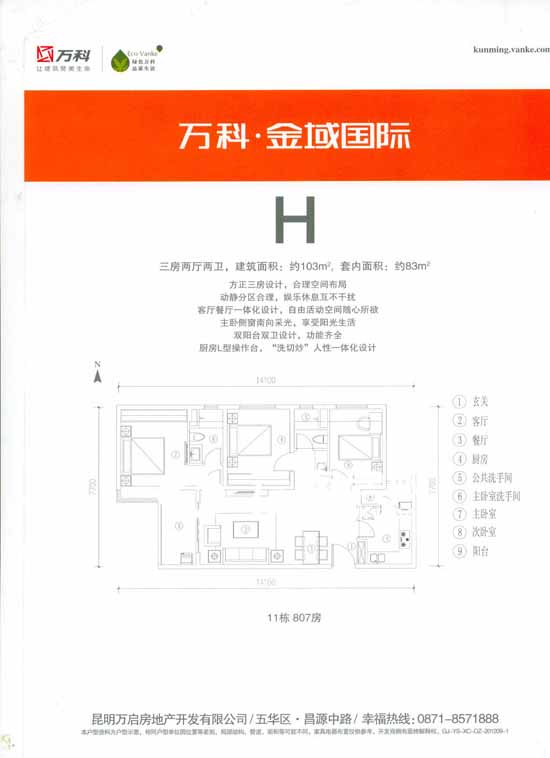 H戶型為三房兩廳兩衛(wèi),建筑面積約103平米,套內(nèi)面積約83平米,公攤約合19%。該戶型主要分布在11棟的7層和8層,方正的三房設(shè)計,空間布局比較合理緊湊。主臥室側(cè)窗南向采光,空氣清新,光照充足。廚房帶有生活陽臺,采光充足,生活陽臺不但可以作為晾曬空間,也能讓室內(nèi)不會受到油煙侵擾。
