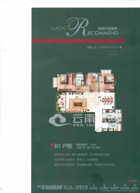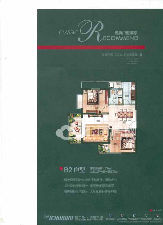 B2戶型為77平米的兩室兩廳一廚一衛(wèi)三陽臺(tái)。B2戶型是8個(gè)戶型中唯一小于100平米的小戶型,也是所有戶型中唯一的兩房戶型。該戶型的朝向是東西向的,如果喜歡接受早晨第一縷陽光寵愛的話可以選擇東向戶型,喜歡坐在飄窗上看夕陽的購房者選擇西向戶型也不錯(cuò)。該戶型進(jìn)門即為餐廳和廚房,方便處理生活垃圾,不必污染其他區(qū)域。廚房連接生活陽臺(tái),方便主人洗曬。衛(wèi)生間通過生活陽臺(tái)采光,明廚明衛(wèi)。主臥帶有一個(gè)外凸飄窗,飄窗面積完全贈(zèng)送,很好的延伸了室內(nèi)空間。客廳連接觀景陽臺(tái),主人閑暇時(shí)間可以再這品茗看書,或者閑敲棋子。整體來看,該戶型比較緊湊,干濕分離,不足的是缺少玄關(guān)設(shè)計(jì),業(yè)主適當(dāng)改造一下就很不錯(cuò)了。